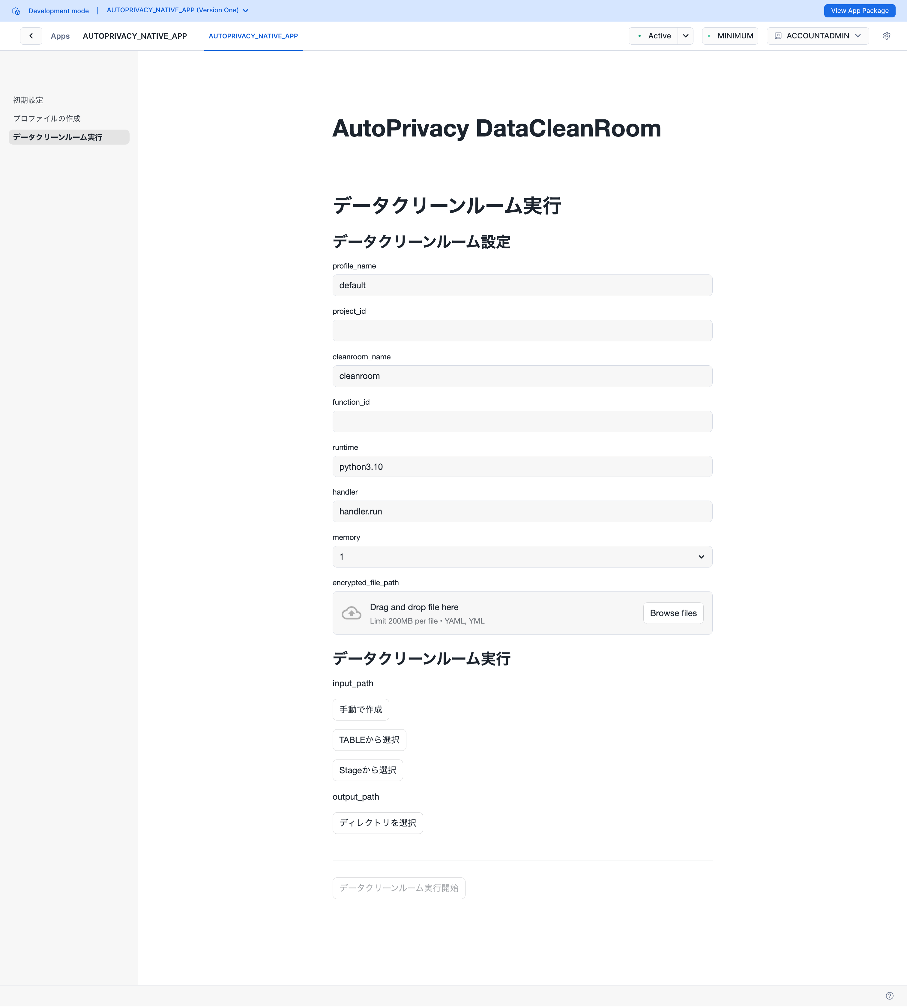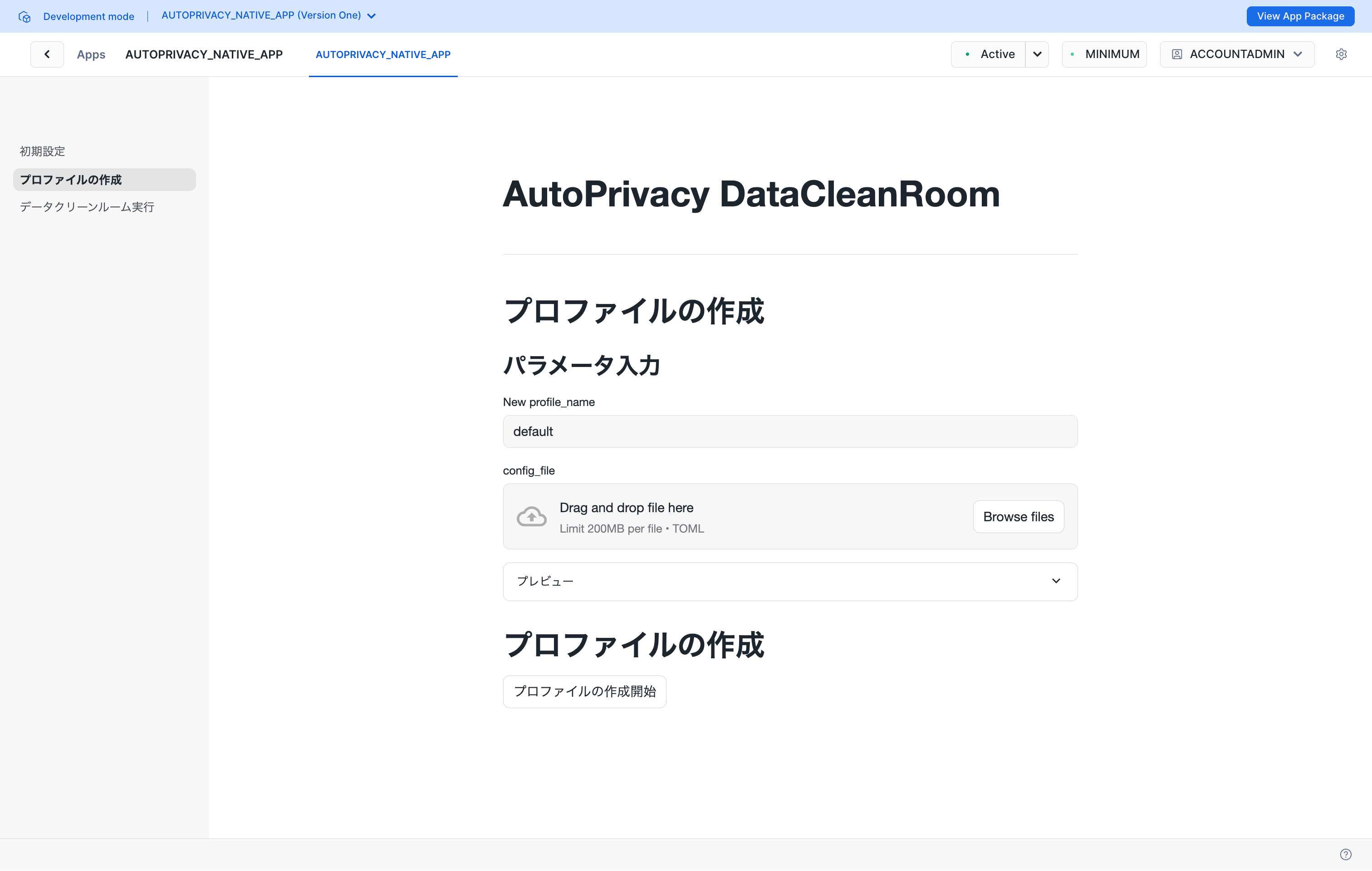 本ページでは、APC-CLIでDataCleanRoomを実行するためのプロファイラ(設定ファイル)の設定を行います。